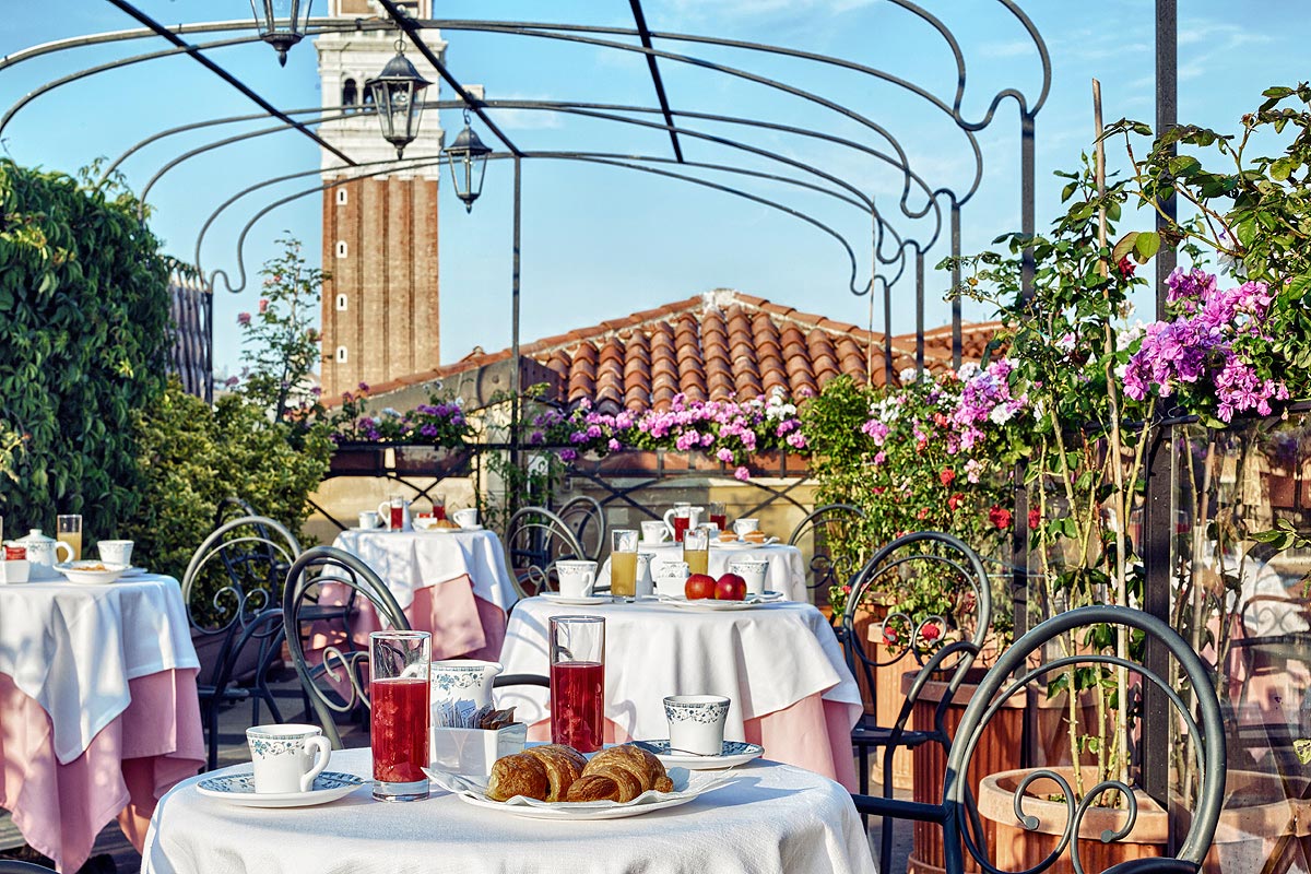 Al 5 piano, nella spledida terrazza con vista panoramica sulla cittá, sul bacino e sulla basilica di San Marco, e’ possible servire la colazione.